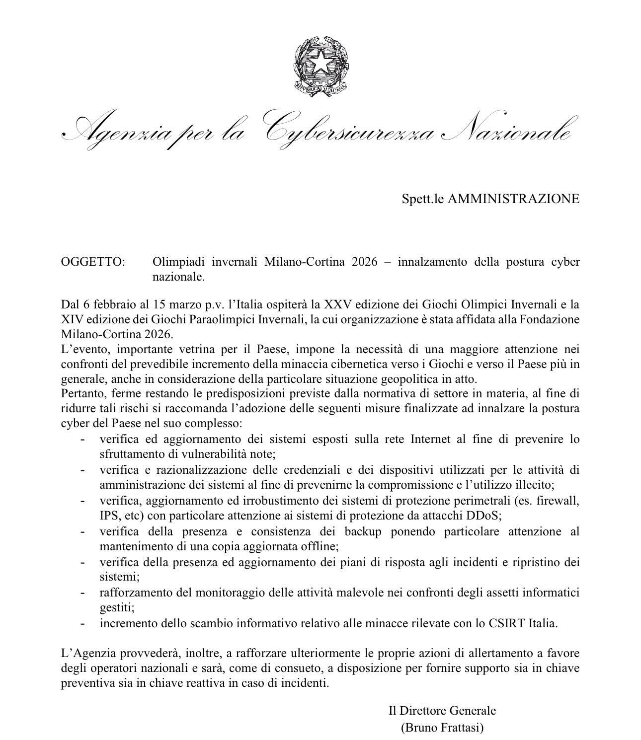 Molti amici mi dicono che hanno trovato nella PEC aziendale un comunicato di ACN, l’Agenzia per la Cybersicurezza Nazionale, indirizzata all’amministrazione che avverte dell’evento imminente e ricorda che è necessario alzare il livello di guardia per gli attacchi cibernetici.